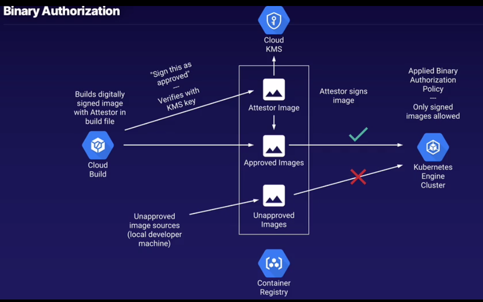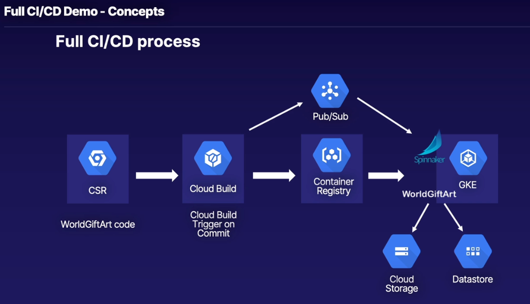• CSR, Cloud Build trigger, Cloud Builder file, custom app backends, K8's YAML files for Spinnaker, Container Registry Vulnerability scanning